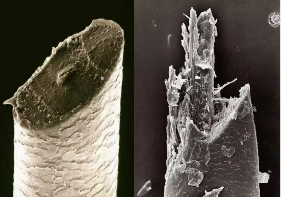 在電子顯微鏡的掃描下,被手動(dòng)剃須刀剃過(guò)的胡子,平滑干脆。而使用電動(dòng)剃須刀后的掃描,簡(jiǎn)直就像是強(qiáng)行撕扯出來(lái)的一樣。